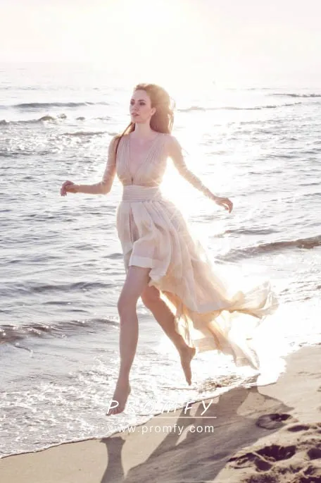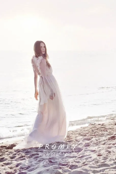Sexy sheer nude chiffon A-line high-low summer beach bridal dress with 3D flowers low back. Plunging V neckline and long sleeves. It's also perfect for a bridal shower or photoshoot dress.