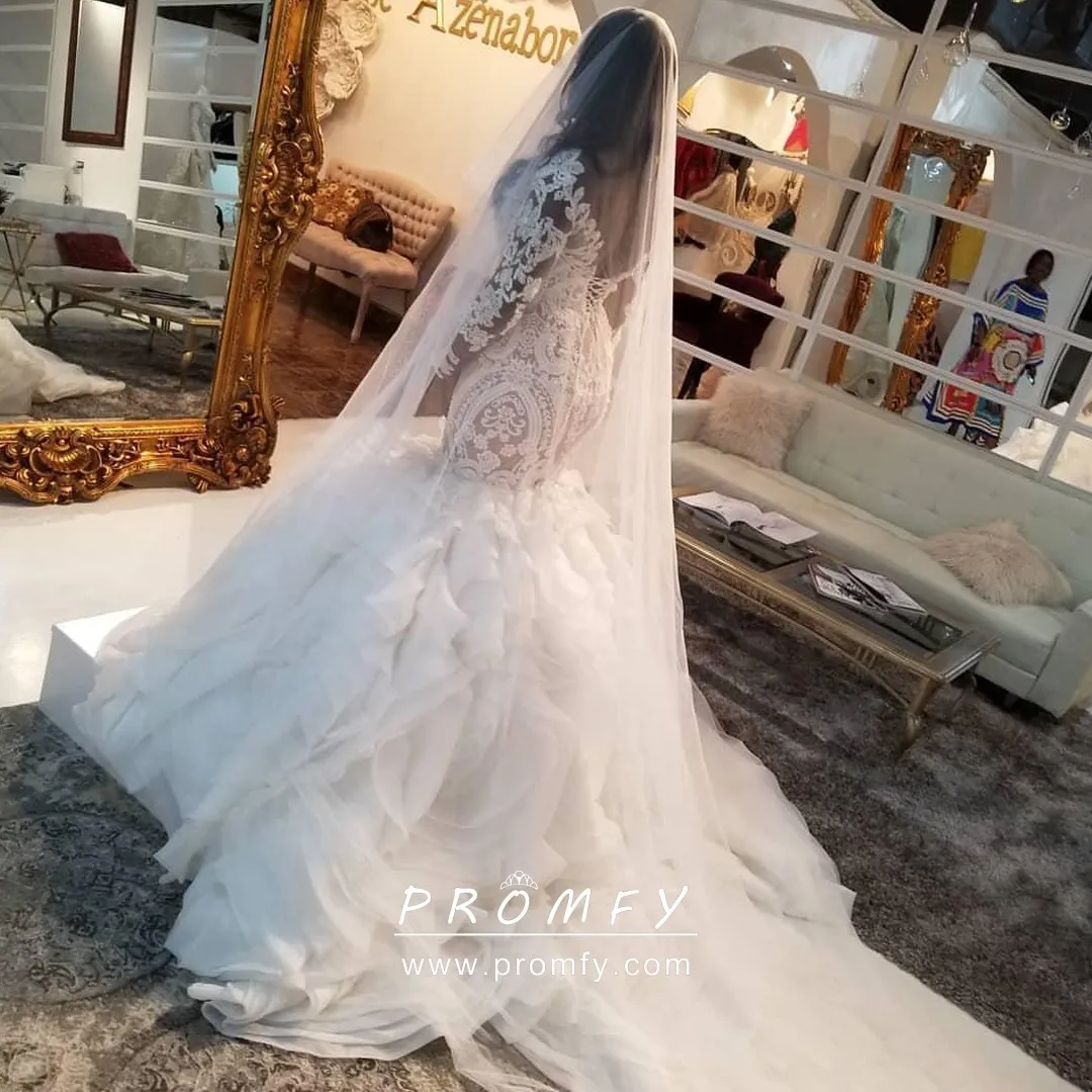 Off-the-shoulder abstract lace top with nudging lining, sweetheart neckline, drop waist, cascading ruffled white organza skirt with court train. Dramatic lace and organza mermaid spring/fall/winter wedding gown.