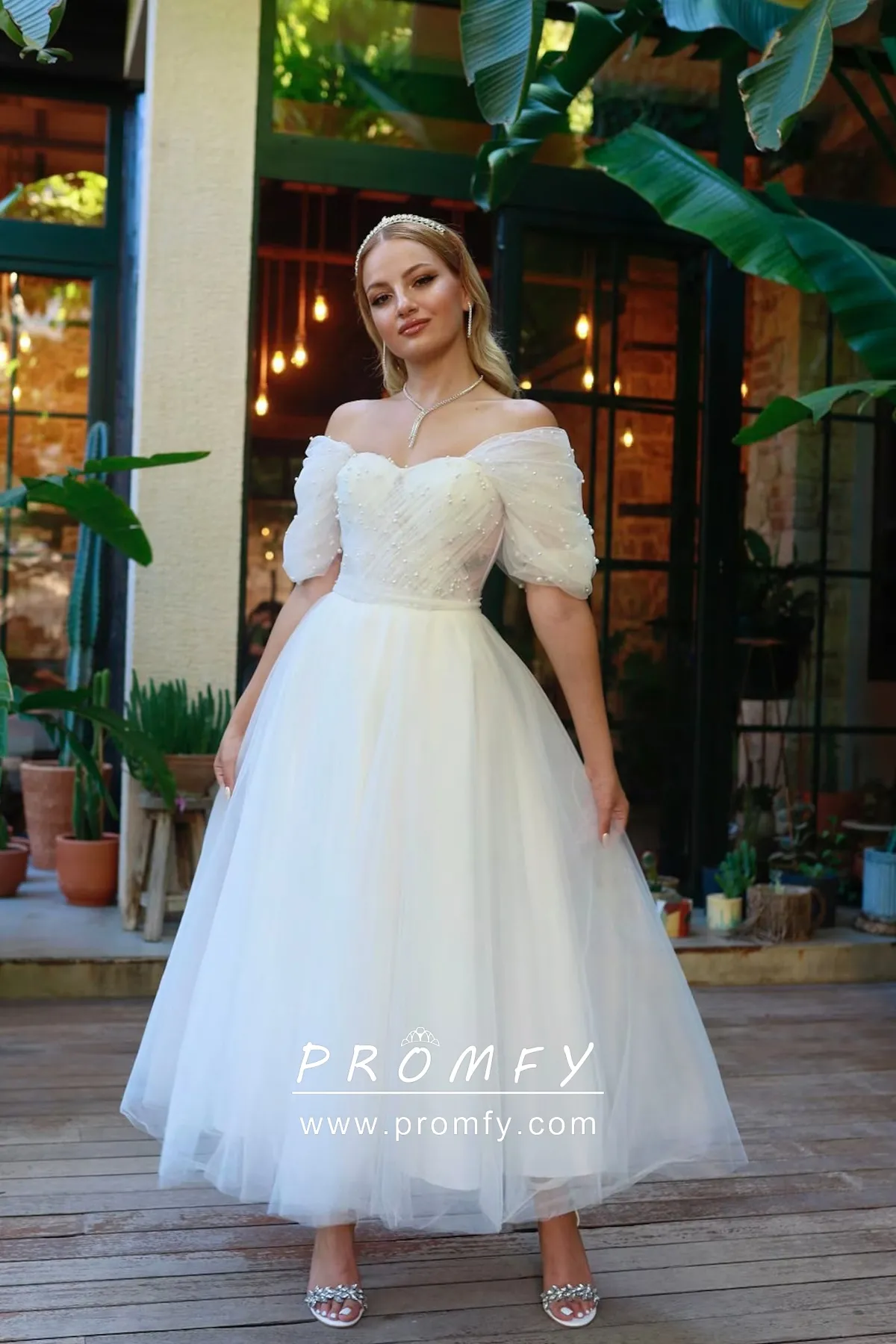 Off-shoulder Pearled Tulle Ankle-length Bridal Dress