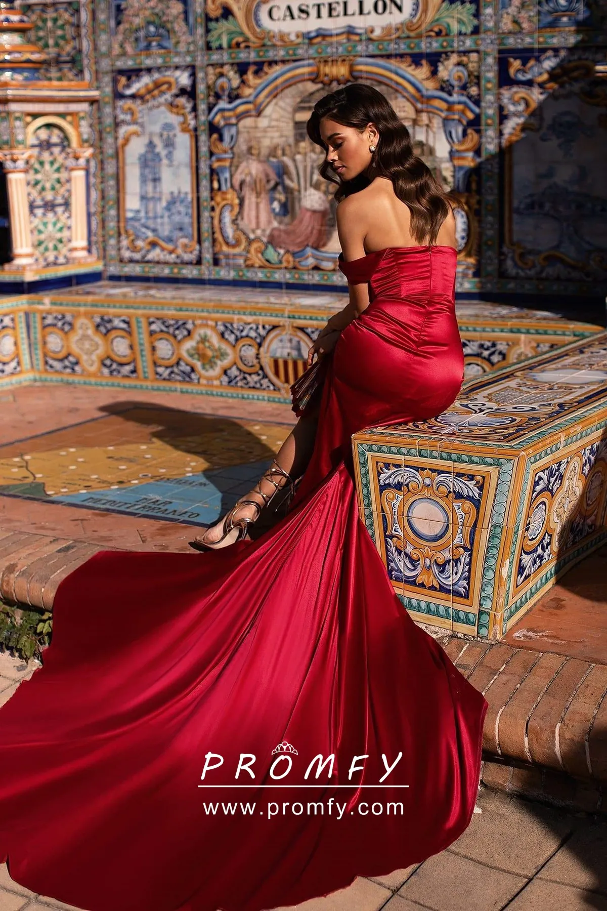 Off-shoulder Red Satin Slit Long Train Prom Gown