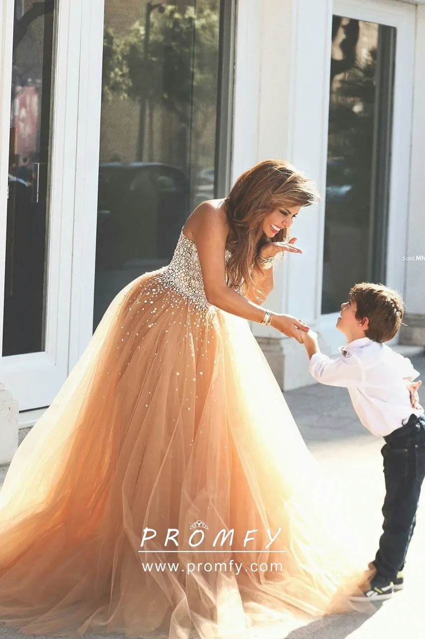 Adorable pearls embellished bodice, champagne nude tulle long puffy prom dress, strapless sweetheart nude tulle formal engagement party gown with a short train.