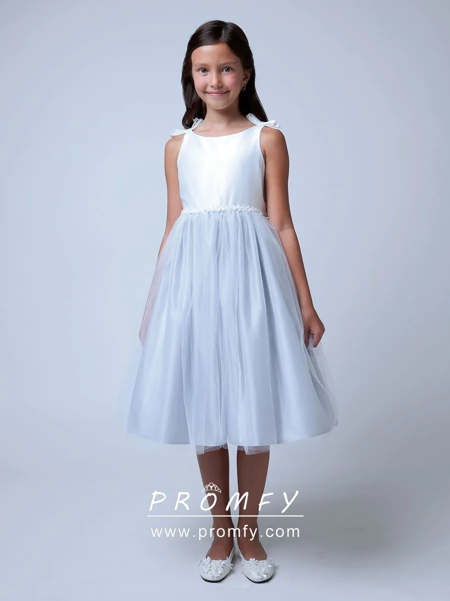 Shiny white and light green satin two-tone flower girl dress for kids. Jewel neckline. Bow knot on the shoulder straps. Pearl embellished waist. Tulle overlay skirt.