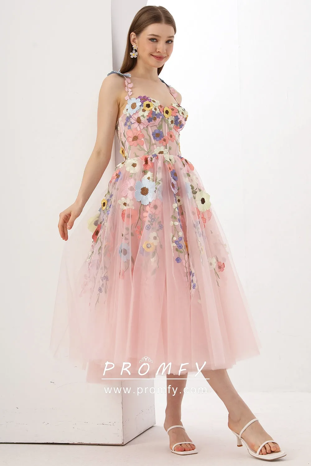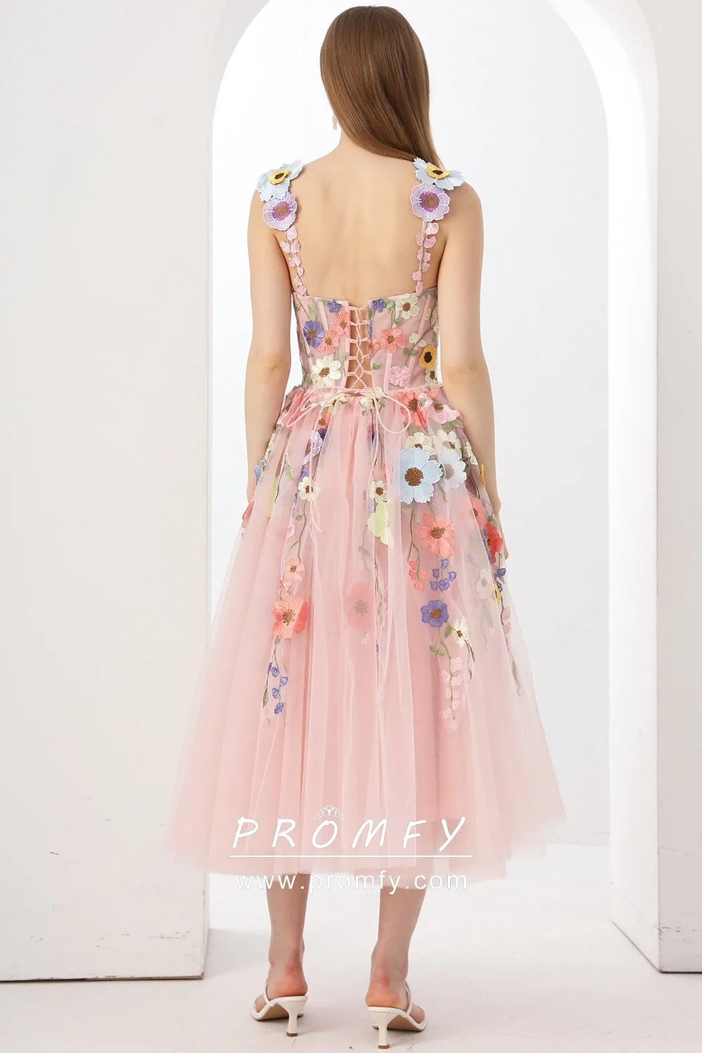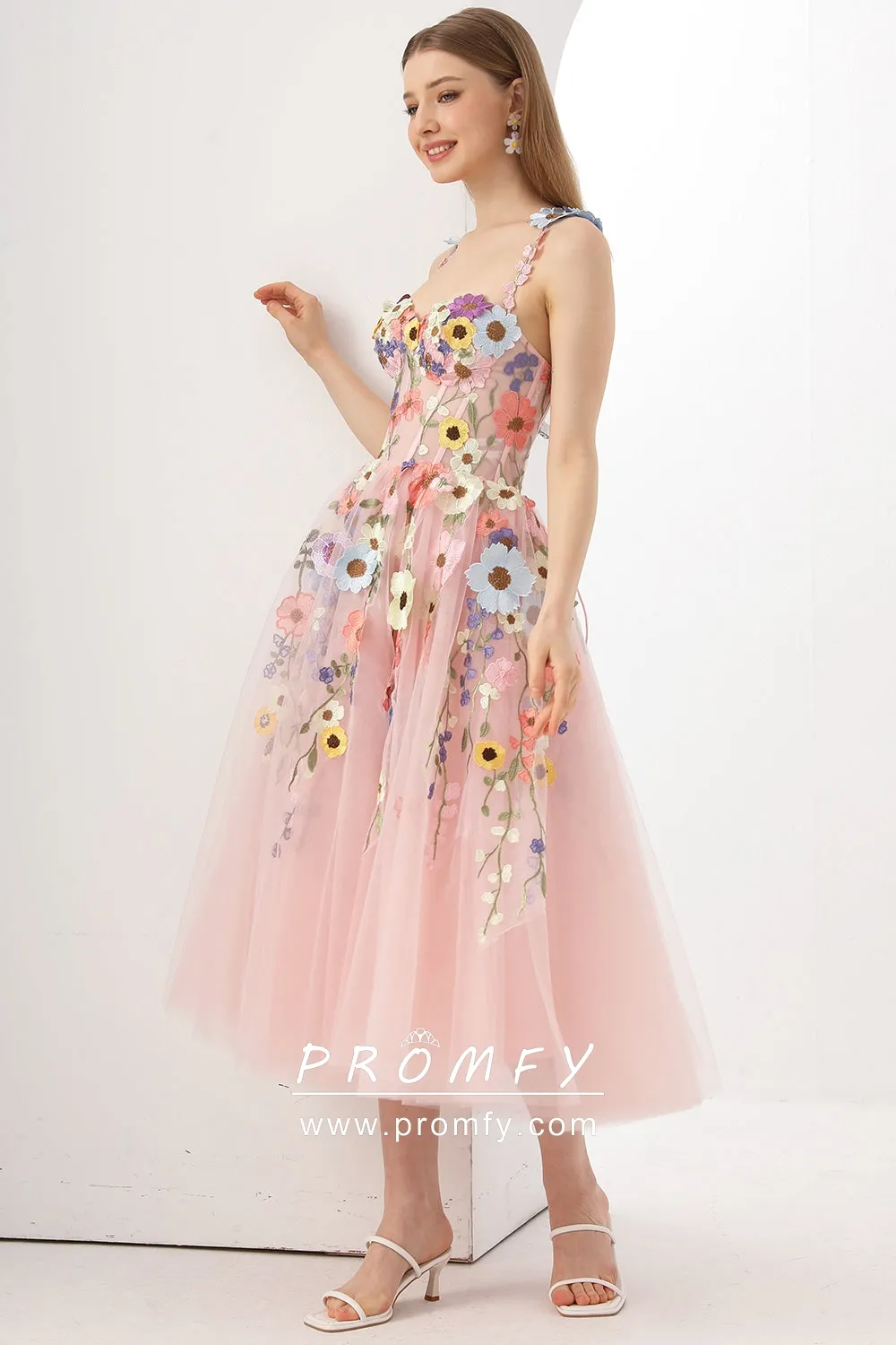 Pink Floral Lace Sheer Corset Straps Midi Prom Dress