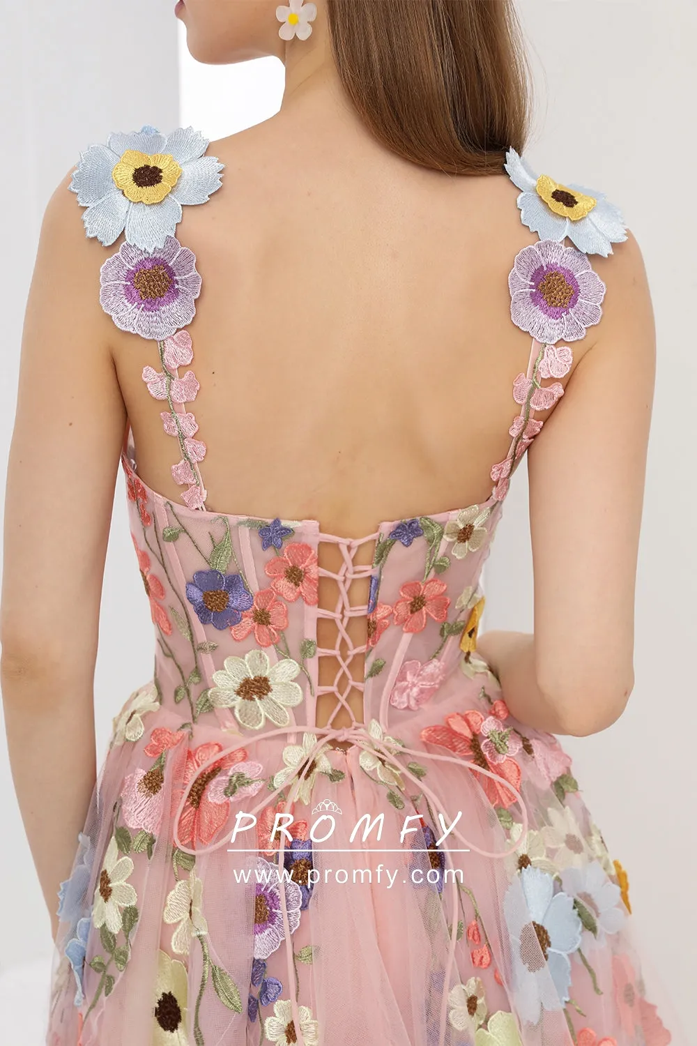 Indulge in the romantic charm of our sheer corset pink flower lace and tulle midi dress. Featuring delicate floral appliques, elegant shoulder straps, and a lace-up low back, this fairy A-line puffy tea-length dress exudes sophistication and femininity. Perfect for homecoming, graduation, prom, and birthday parties, this dress will make you feel like a work of art.