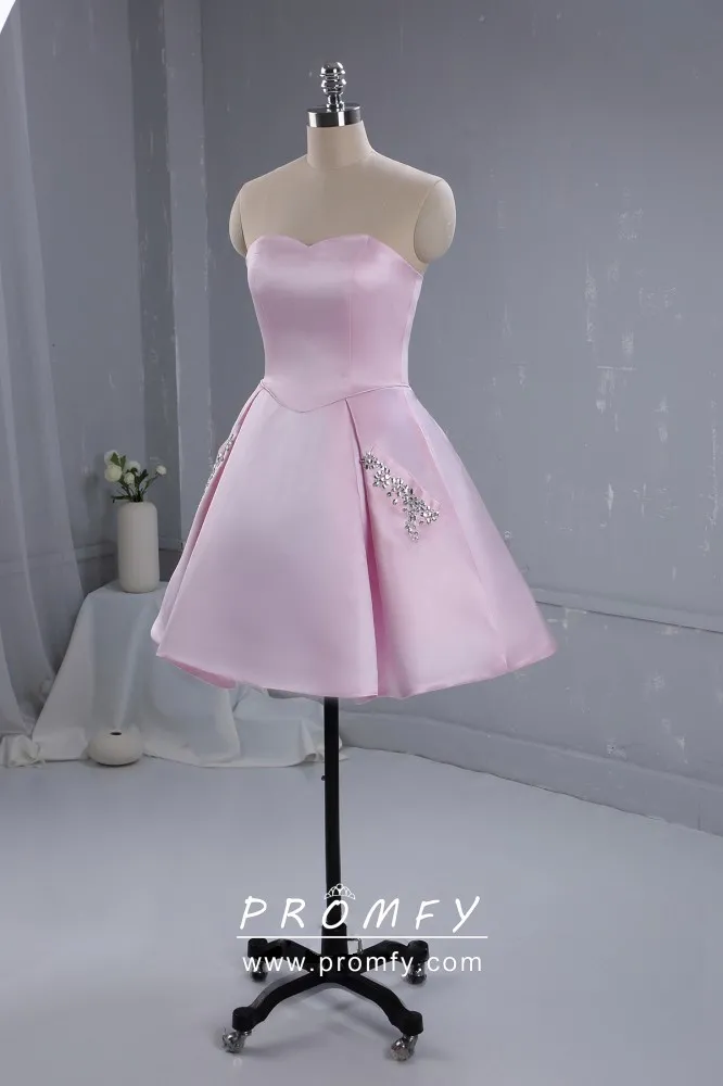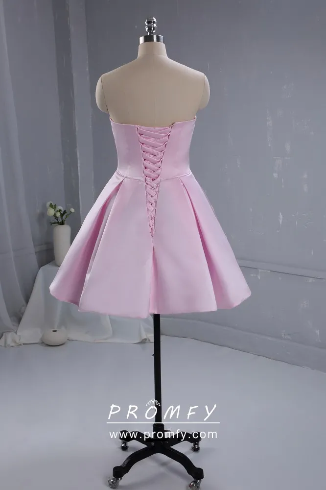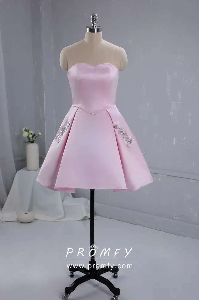 Pink satin short cute cocktail party dress with beaded pockets. Strapless sweetheart candy pink satin short graduation or homecoming dress. Lace up low back.