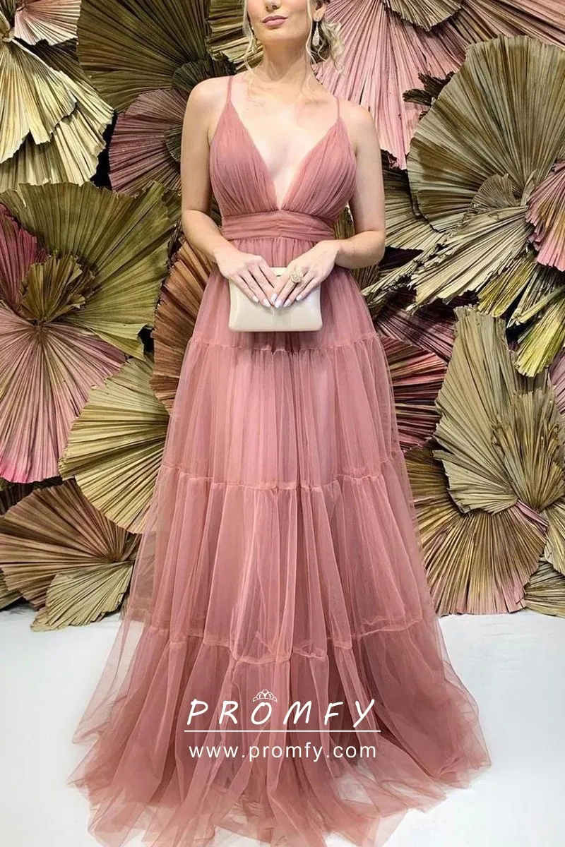Feminine Plunge Neck Mauve Pleated Tulle Evening Dress