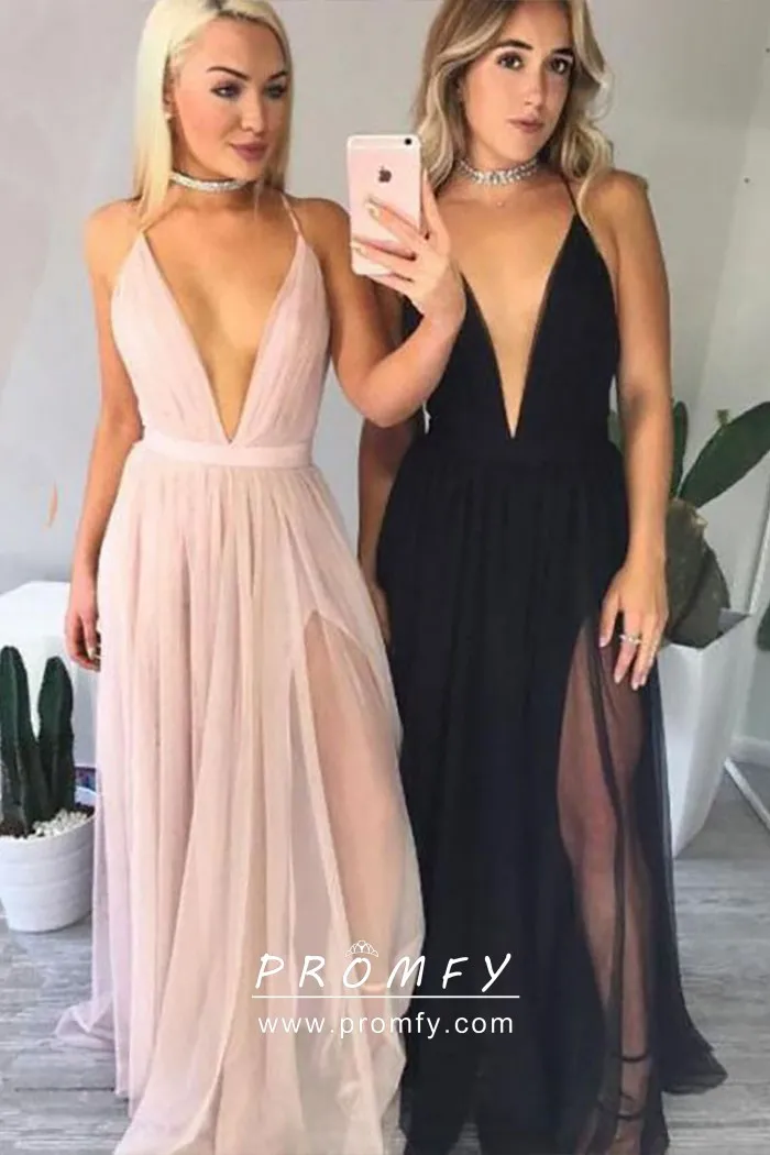 Sexy plunging V-neckline thigh-high split black tulle prom party dress. Spaghetti straps A-line long simple party dress.