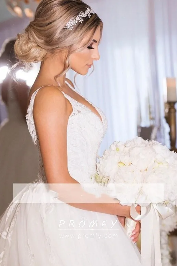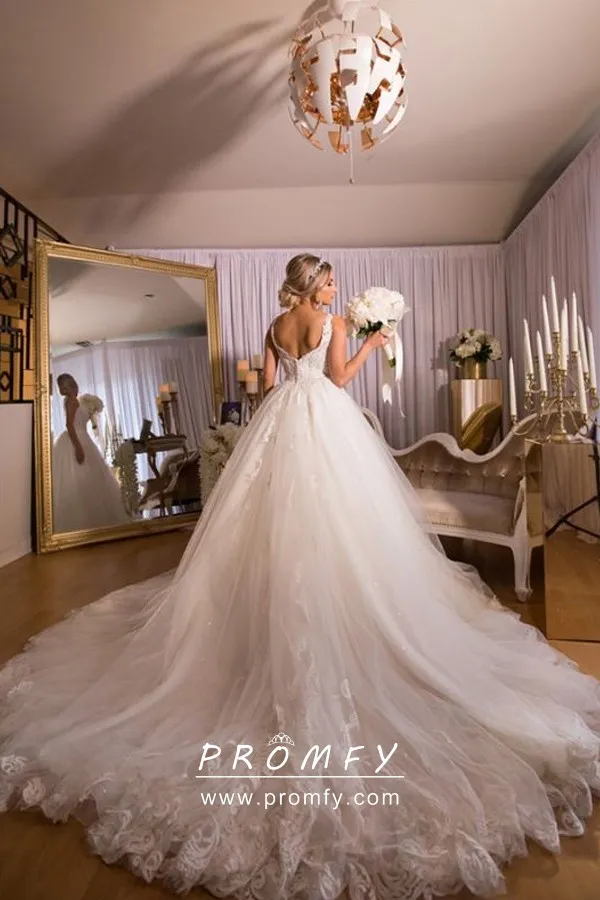 Princess V-neck lace and tulle spring/fall/winter wedding gown. Corset lace bodice with shoulder straps, ball gown silhouette princess tulle lace wedding dress with buttons adorned zipper up low back. Chapel train.
