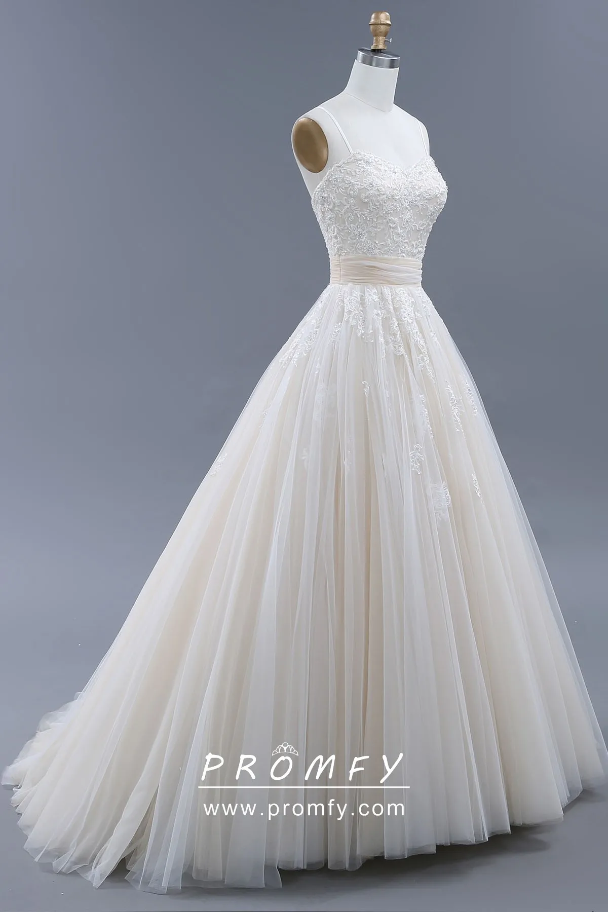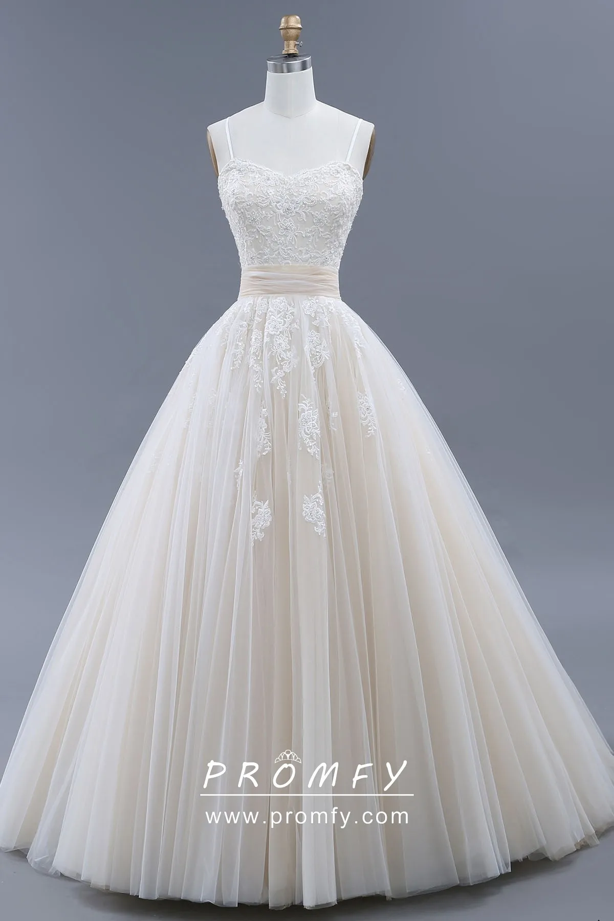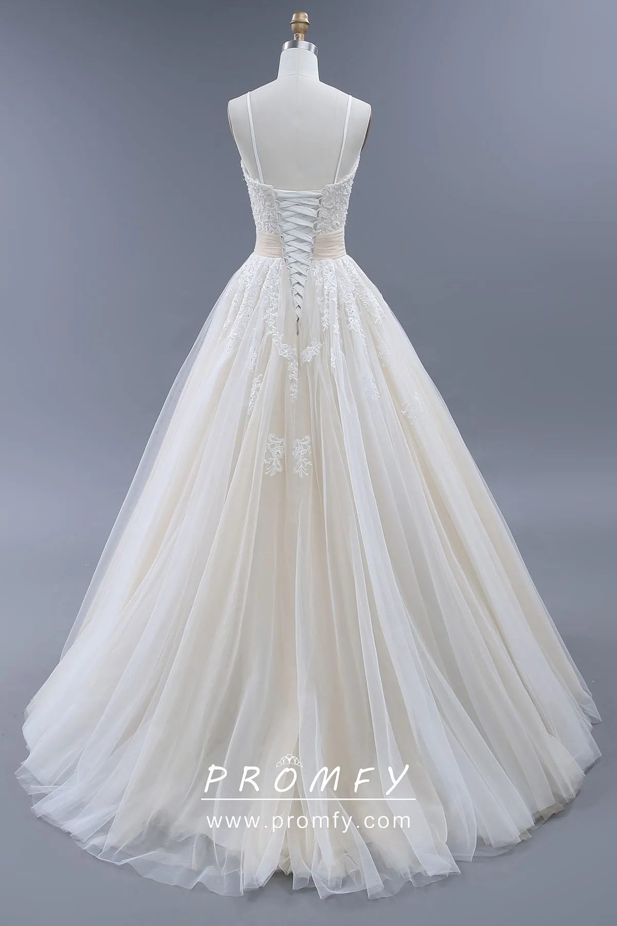Princess ball gown spring/fall/winter wedding dress with spaghetti straps. Classic semi-sweetheart neckline cream lace and tulle bridal ball gown. Lace up low back. Court train.