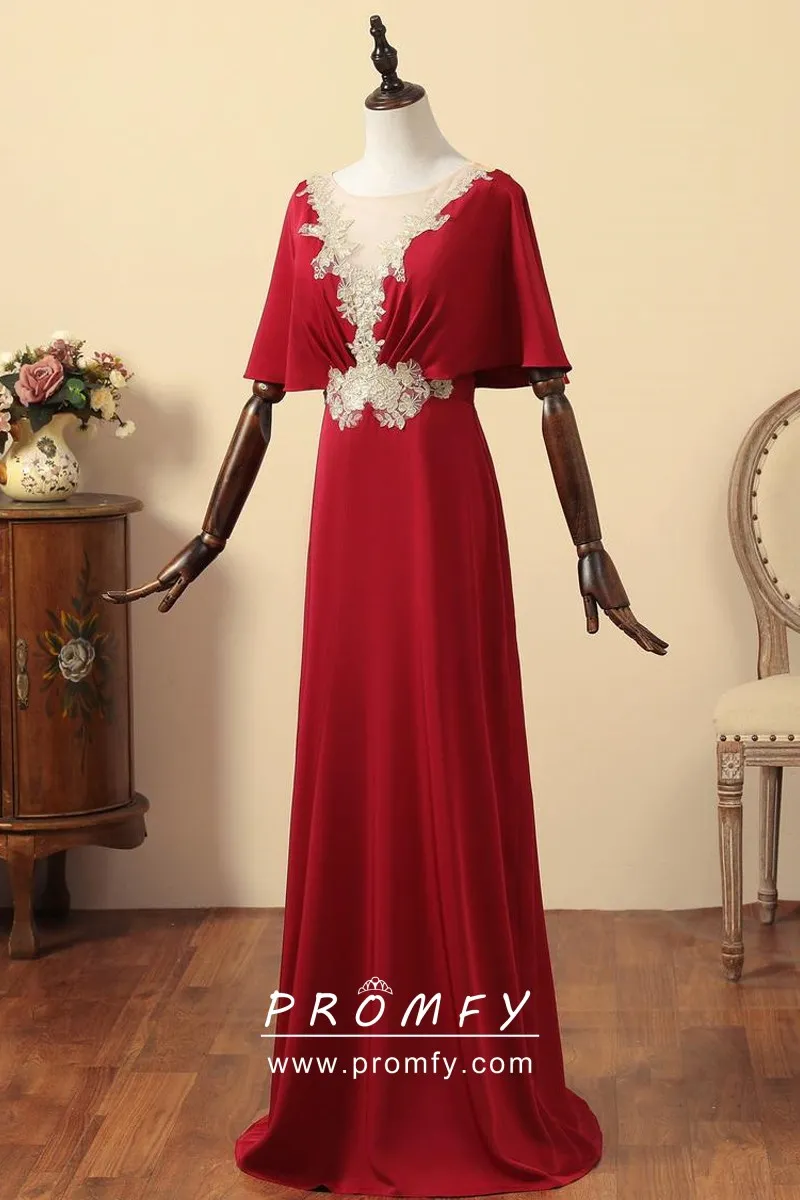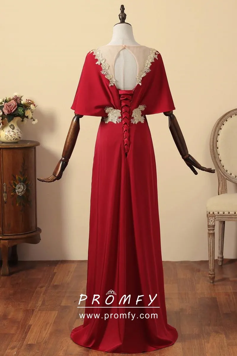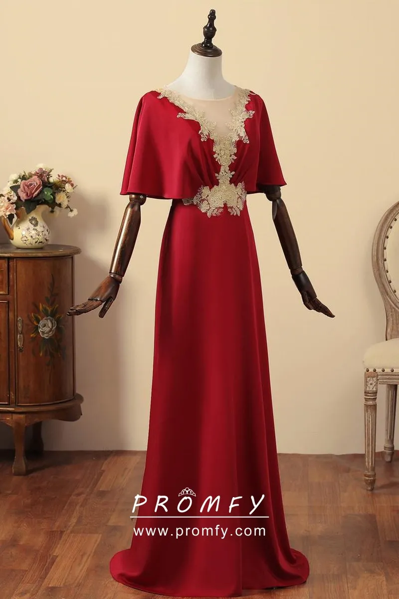 Elegant gold lace appliqued red sleek satin floor-length A-line evening mother-of-the-bride evening formal dress, illusion deep V neck, puffy short sleeves, lace up keyhole back.