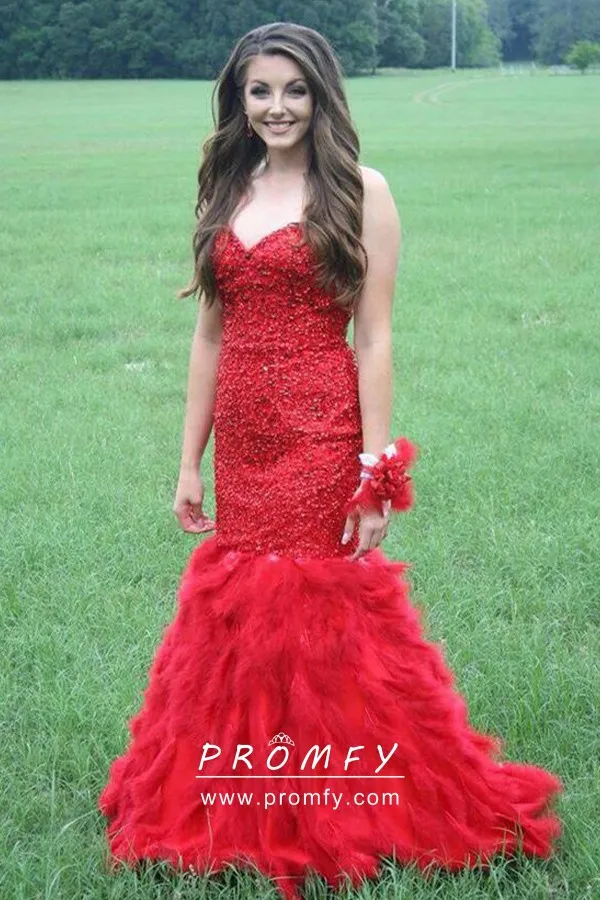 Beautiful red beaded satin bodice feather skirt floor length trumpet long engagement dress. Strapless sweetheart drop waist red cute prom gown.