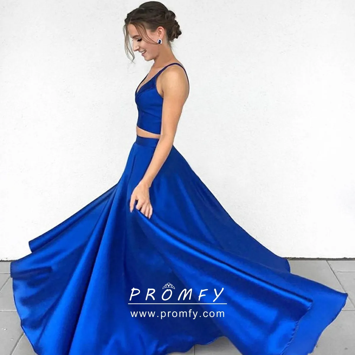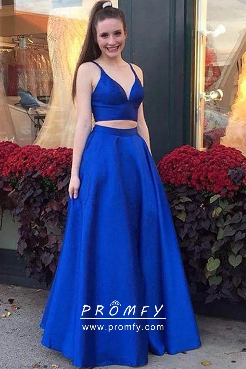 Simple and stylish royal blue satin two-piece prom party or graduation dress for sale, deep V neckline with thin shoulder straps, royal blue long A-line skirt.
