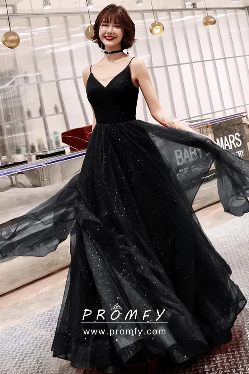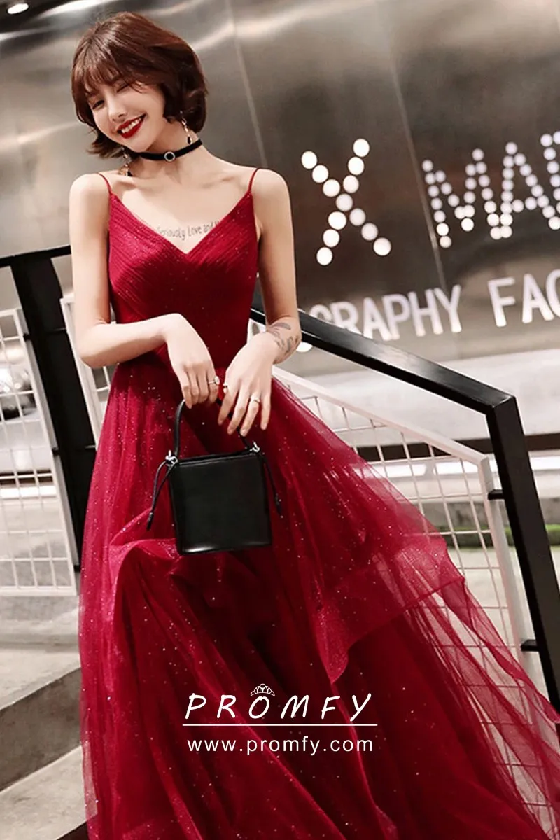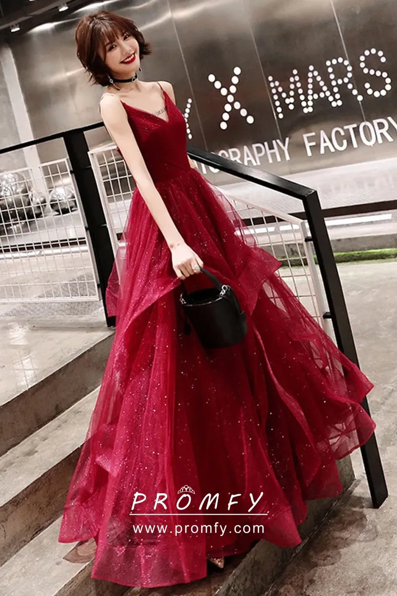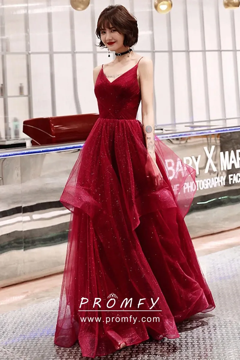 Glittering red glitter tulle puffy long prom or engagement dress, V neckline with spaghetti straps, pleated bodice, red glitter tulle skirt with uneven ruffled hemline.