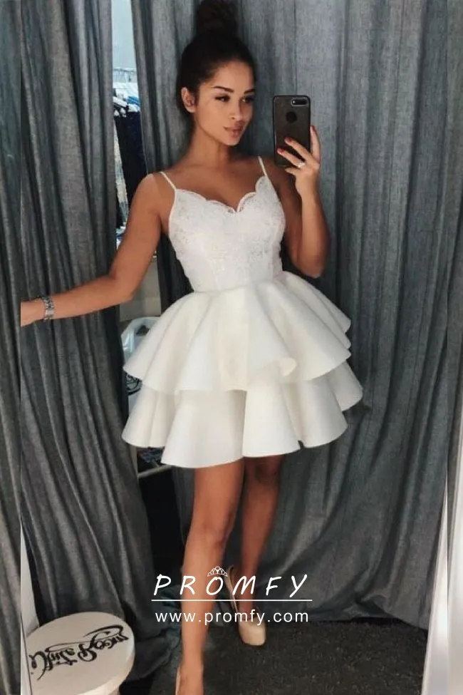 Beautiful off-white lace and satin two-tiered short cocktail or cocktail party dress. Scalloped neckline with spaghetti straps.