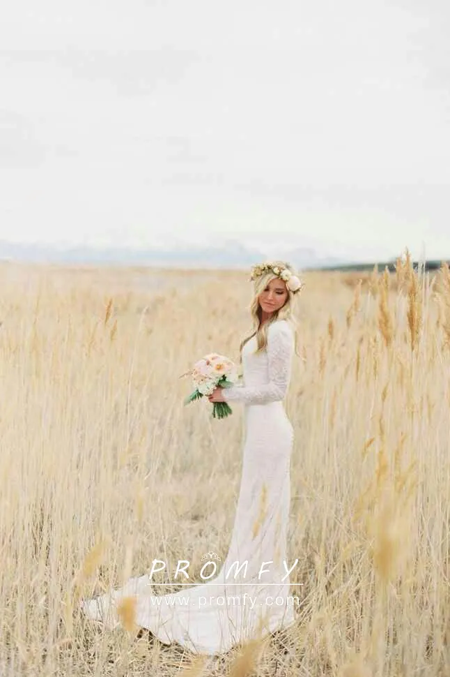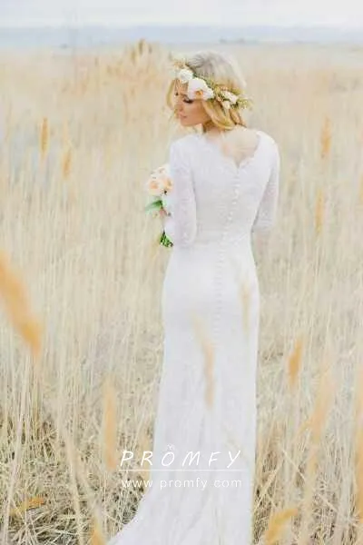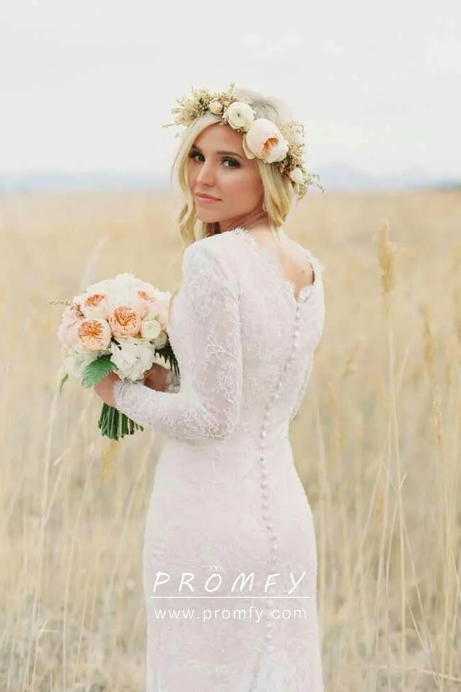 Vintage-inspired rustic style white lace spring/fall wedding dress with a sweep train and long sleeves. Modified A-line silhouette flatters the bodice with a scalloped neckline and a line of buttons on the zipper back.