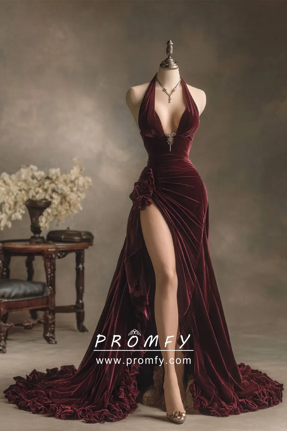 Burgundy velvet sexy prom dress with an asymmetrical thigh-high slit and ruffled train. Dip neckline with halter shoulder strap.