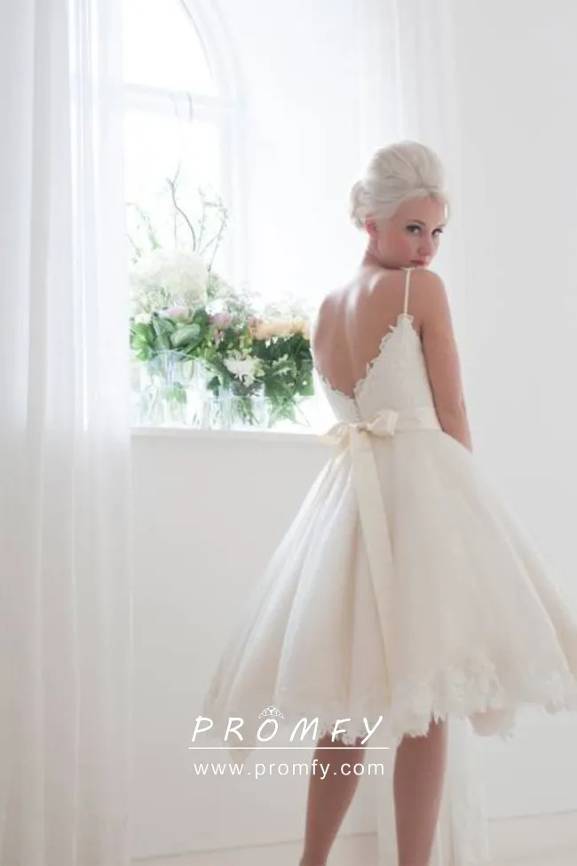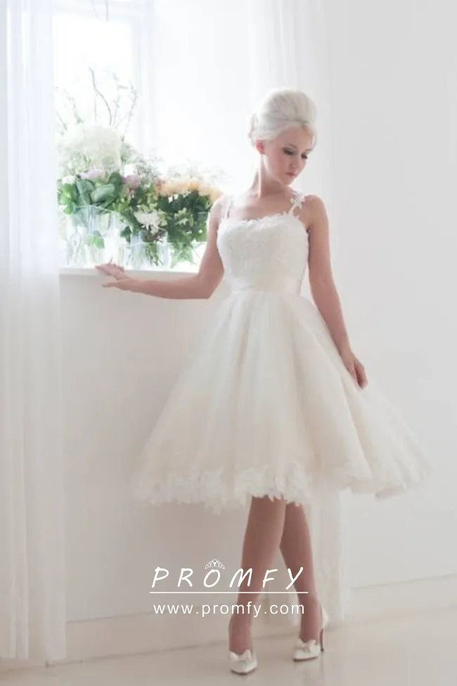 Knee-length ivory lace short spring/summer/fall cute wedding dress with spaghetti straps. Lace adorns the bodice before leading to these delicate straps. A full tulle knee-length skirt gives a dreamy and ethereal feel to this bridal shower dress.