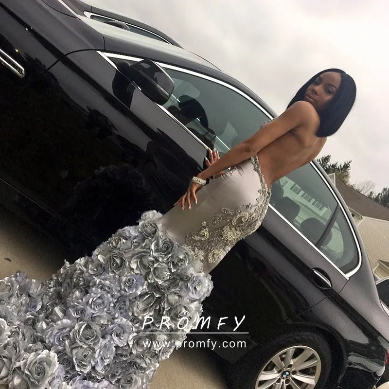 Silver glitter and satin trumpet unique black girl prom gown with 3D rosettes skirt. Sleeveless illusion glitter bodice, thigh mermaid floor-length 3D rose skirt.