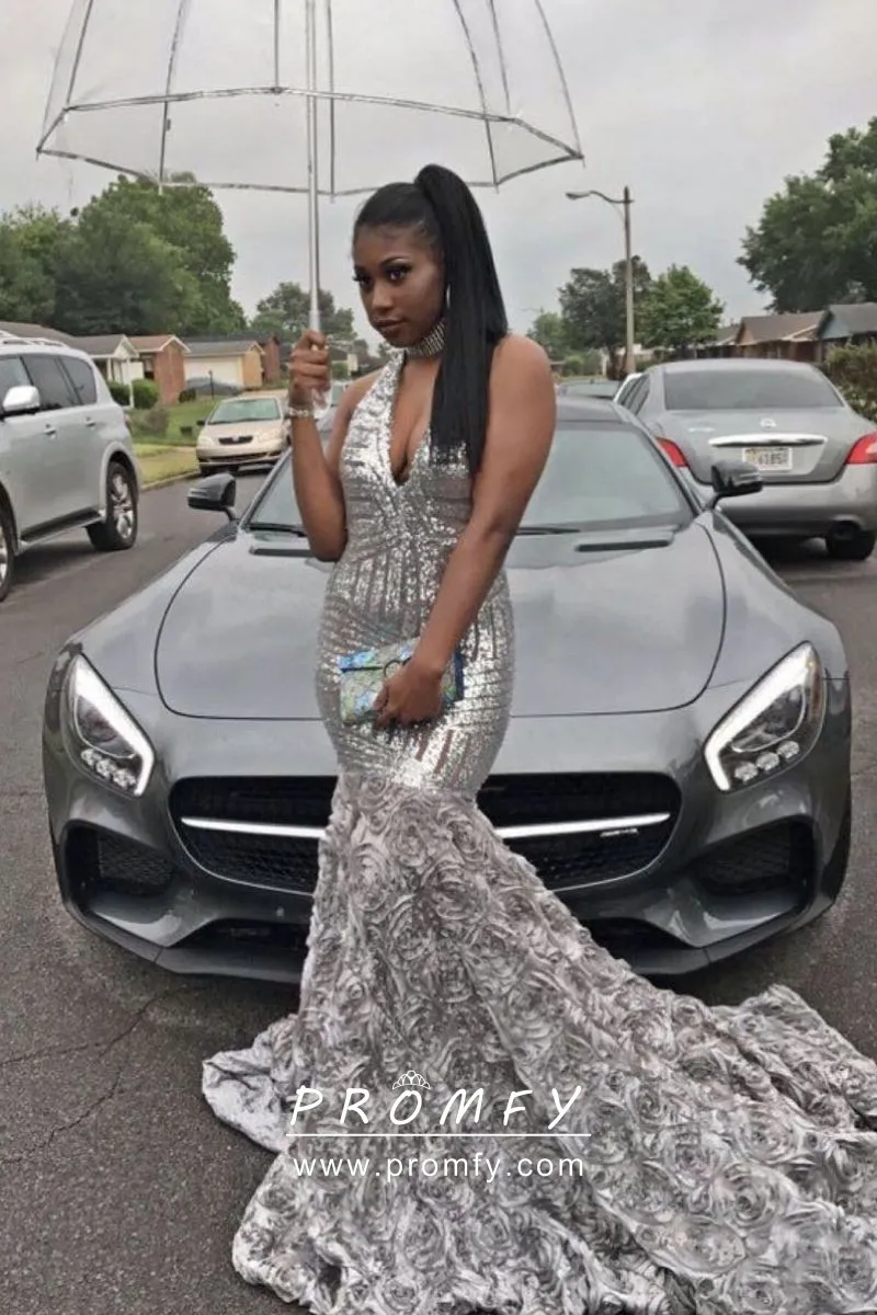 Sparkly striped silver sequin and 3D rose/rosette mermaid African American prom dress with deep V neckline and chapel train.