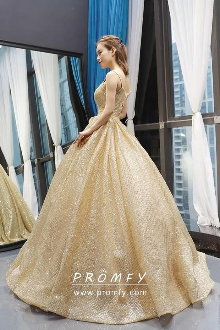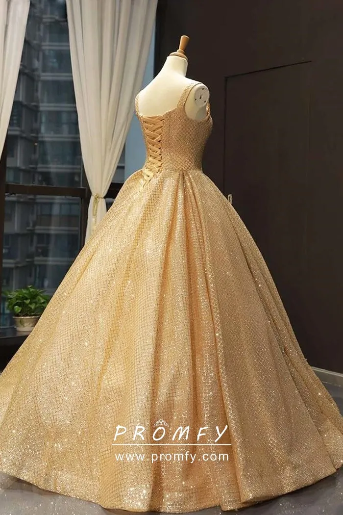 Sparkly gold glitter long ball gown princess prom, Quinceañera, or sweet-16 dress, square neckline with wide shoulder straps corset bodice gold glitter formal dress. Lace up back.