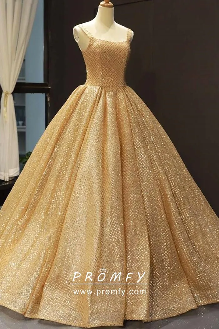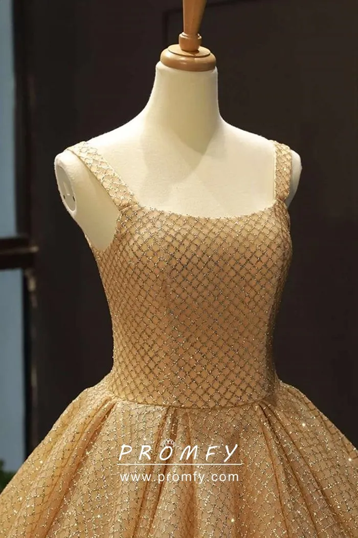 Sparkly Gold Glitter Square Neck Quinceañera Dress