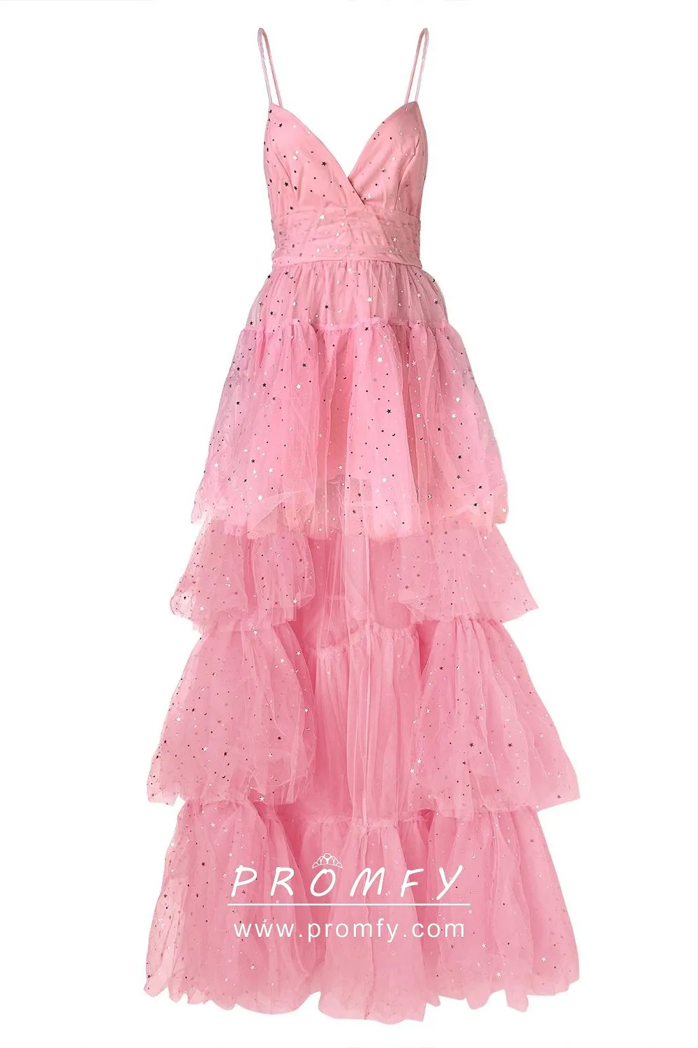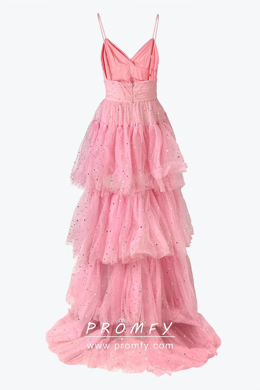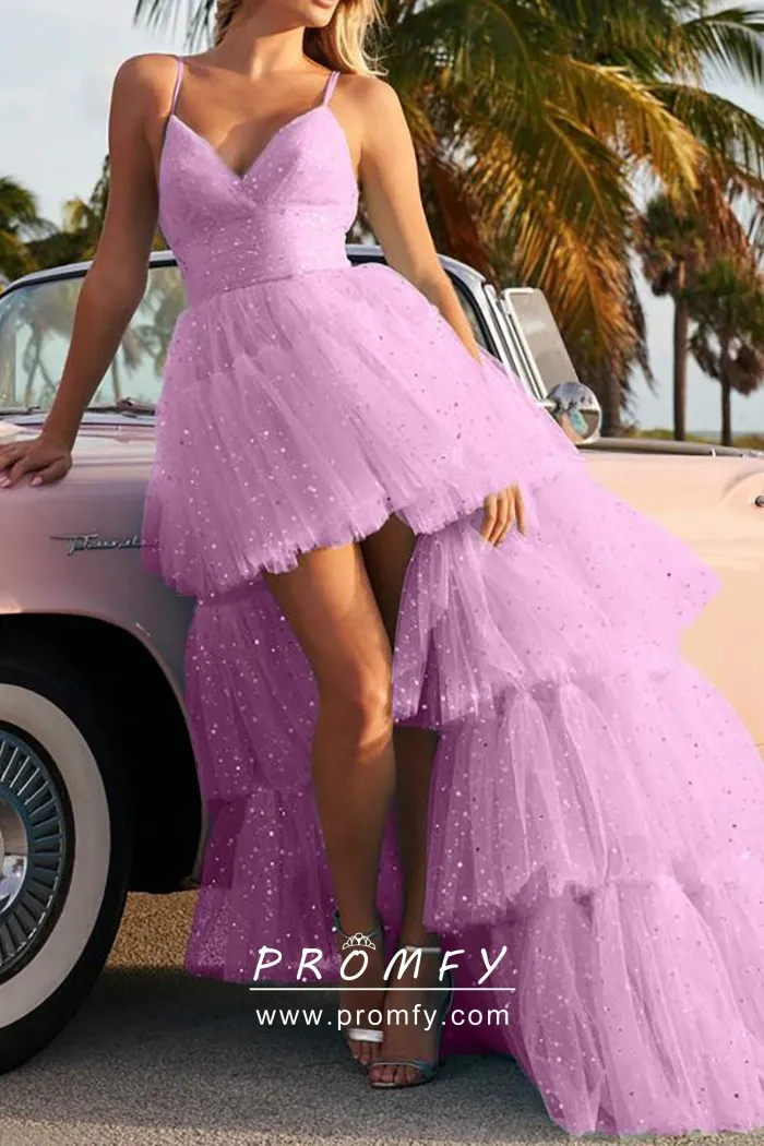 This sweet gorgeous high-low tiered semi-formal prom or birthday party dress created with glitter starry tulle. It showcases a V-neckline with spaghetti straps which leads to a low back. The puffy high-low hemline skirt displays with tiered details.