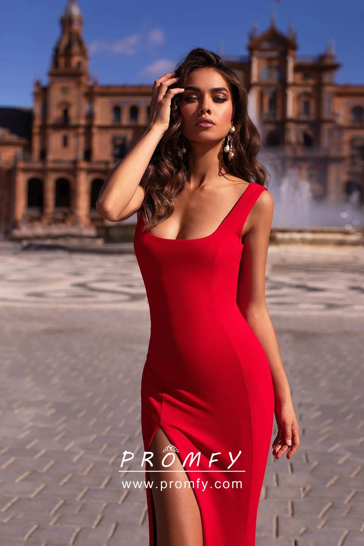 Stylish vibrant red minimalist low-key mermaid simple evening prom formal gown. Scoop neckline, thick shoulder straps & sexy thigh-high slit, and a luxe short train.