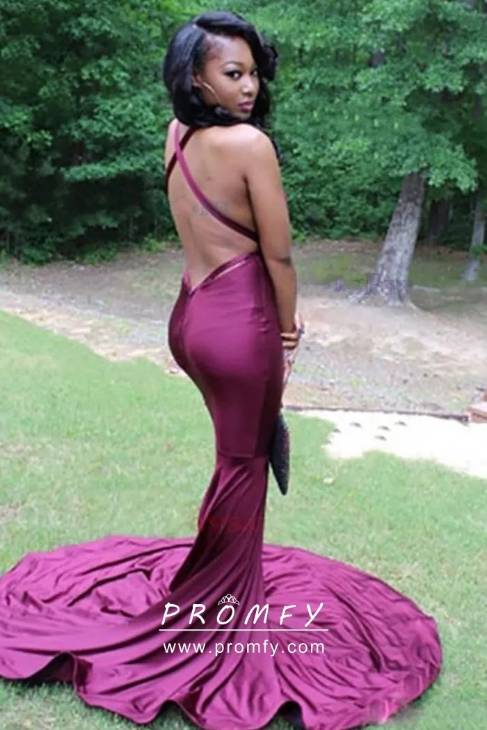 V neckline sleeveless plum satin floor length long mermaid prom dress, elegant plum formal gown with a long train. Low back with criss-cross straps.