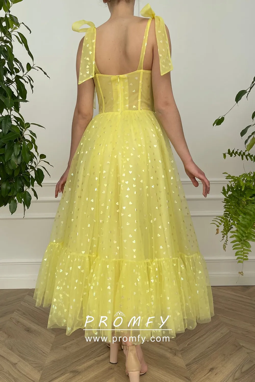 This adorable yellow prom dance or birthday party dress is made of cute hearty tulle and features a corset bodice with decorative buttons. Sweetheart neckline with wide bow straps. An A-line ankle-length tulle skirt with a tailor seam detail.