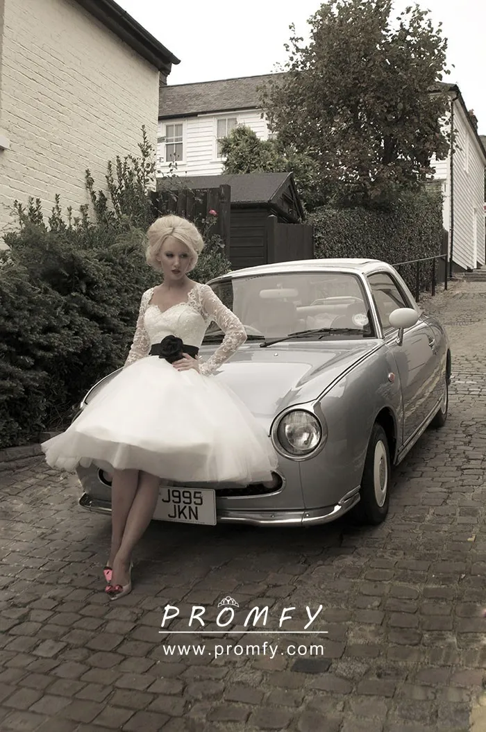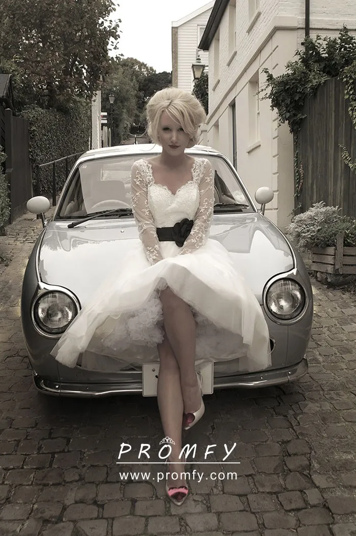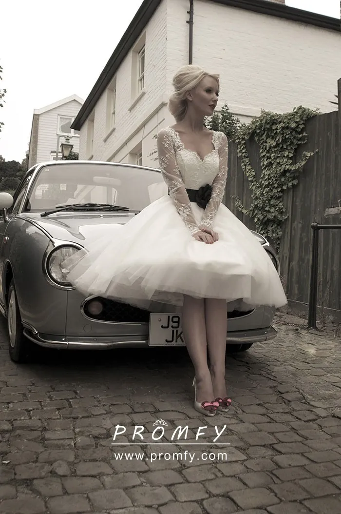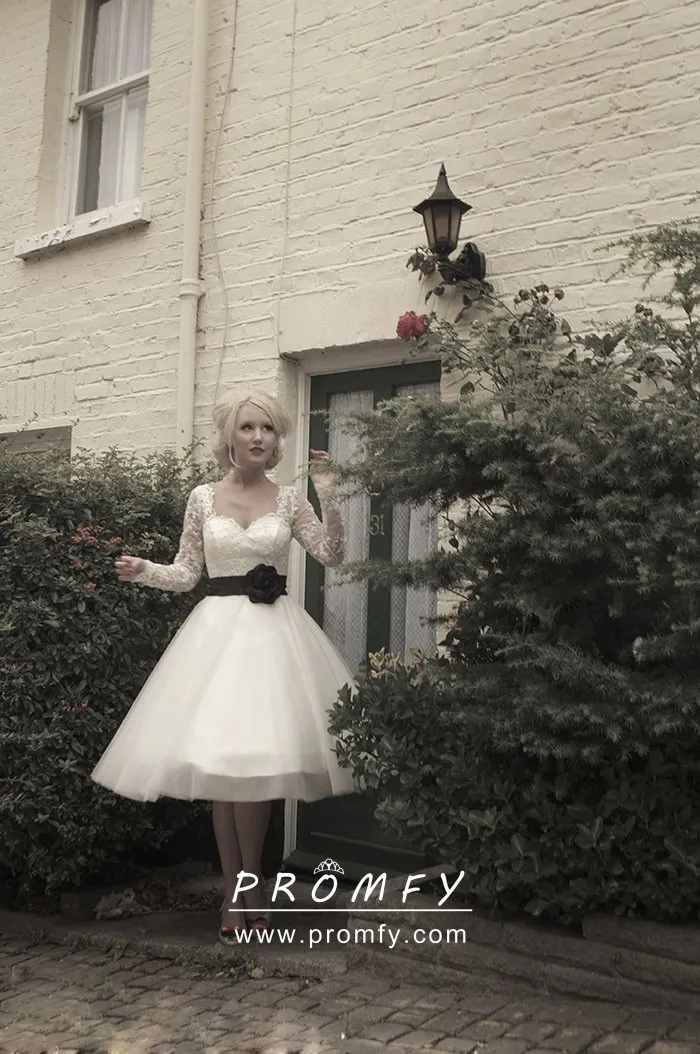 1905s vintage-inspired ivory tulle puffy skirt knee-length short wedding, bridal shower, or reception dress with a full embroidered lace beaded bodice. Jagged sweetheart neckline. Illusion long fitted sleeves, black sash belt with 3D flower.
