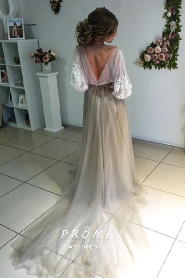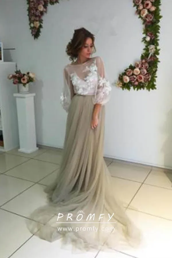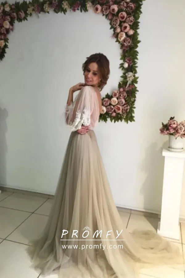 Casual puffy long sleeve illusion white lace bodice with low V back, nude tulle puffy floor length long skirt prom or bridal shower dress with a long train.