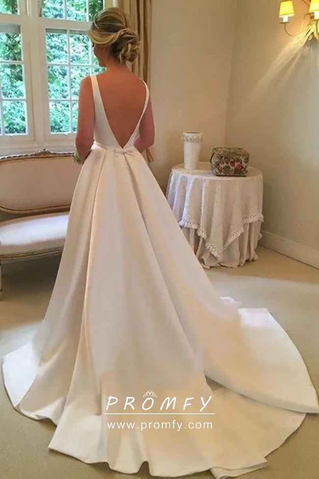 Elegant white satin floor-length puffy spring/fall wedding gown with a court train. Sleeveless bateau neckline, natural waist, low V back.