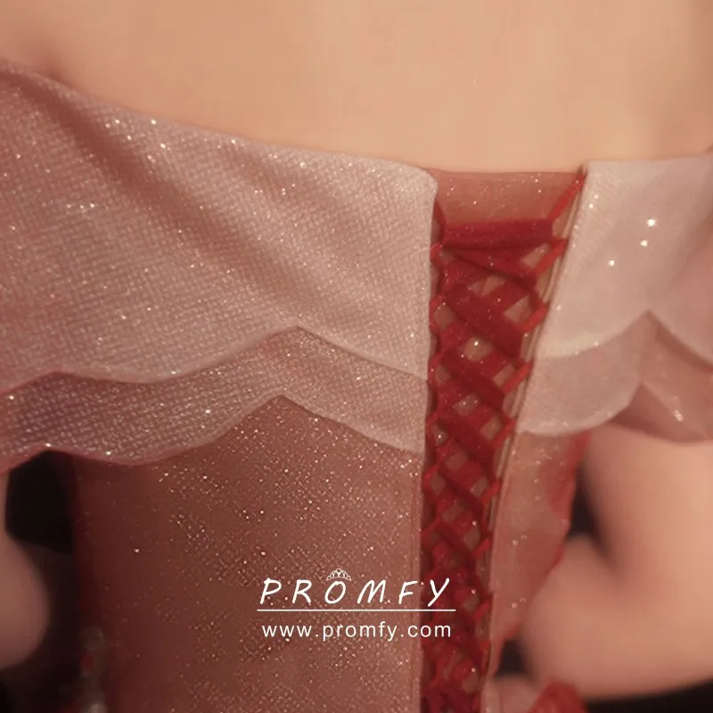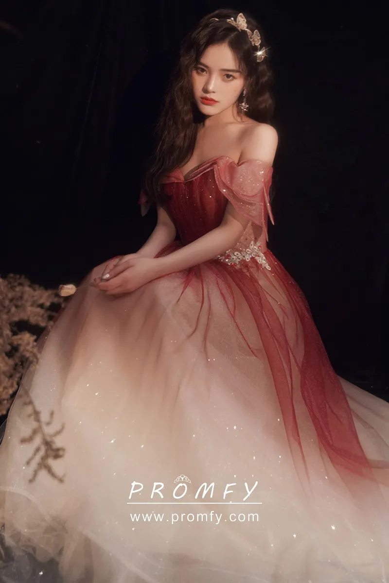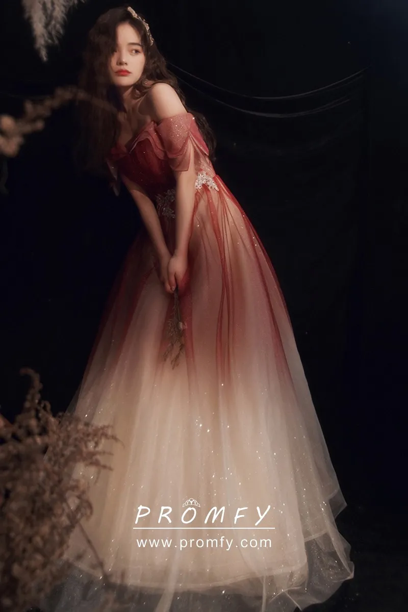 Glamorous wine to cream gradient ombre glitter tulle long A-line prom, engagement, or photoshoot dress, folded off-the-shoulder V neck cap sleeves, lace appliqued belt at waistline, lace up back.