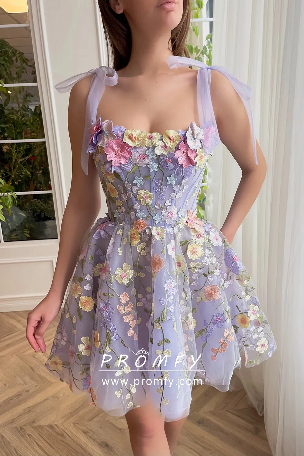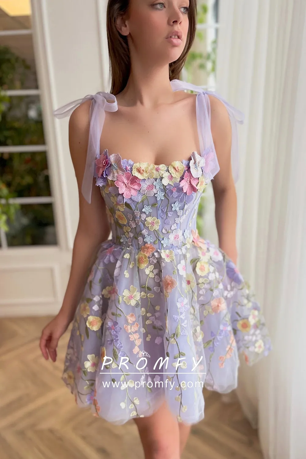 Shine bright at your next celebration in the blooming elegance wisteria 3D floral lace tie-strap A-line short dress! Crafted from lightweight woven fabric, this fairy dress features a subtle burnout texture and delicate floral embroidery throughout. The cute tie-straps support a corset bodice with a scoop neckline. A hidden zipper and clasp at the back ensure a seamless fit, making it the perfect choice for homecoming, proms, birthdays, or cocktail parties.