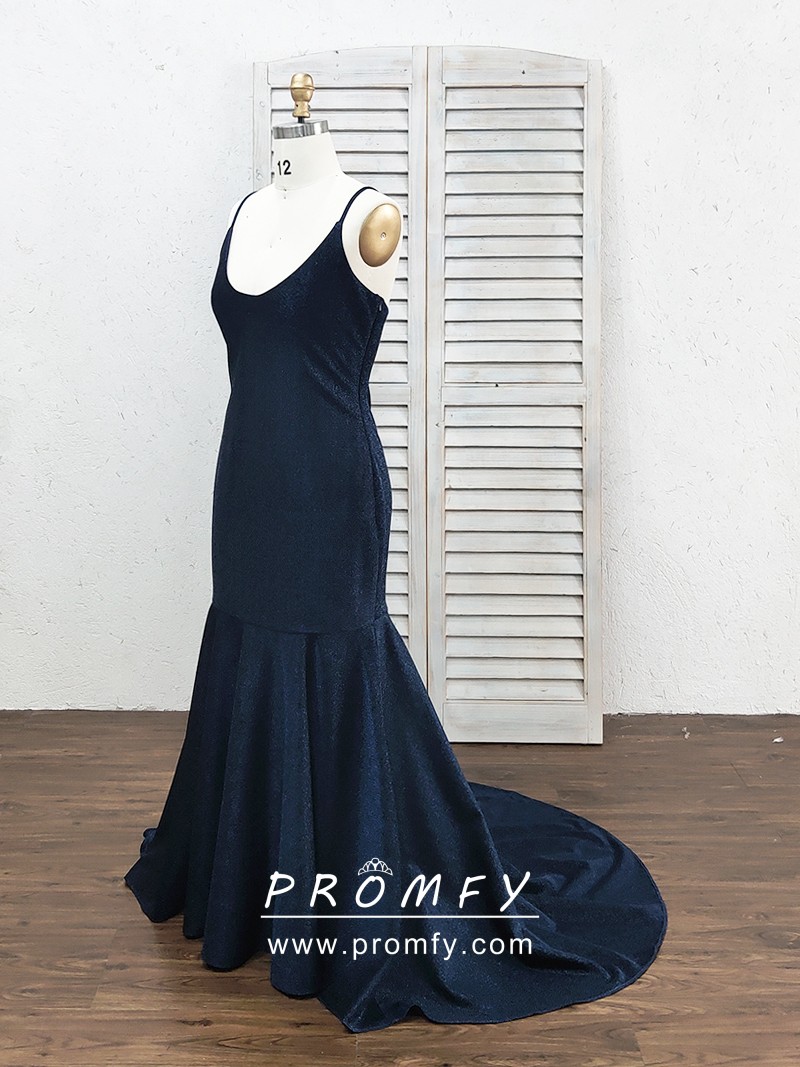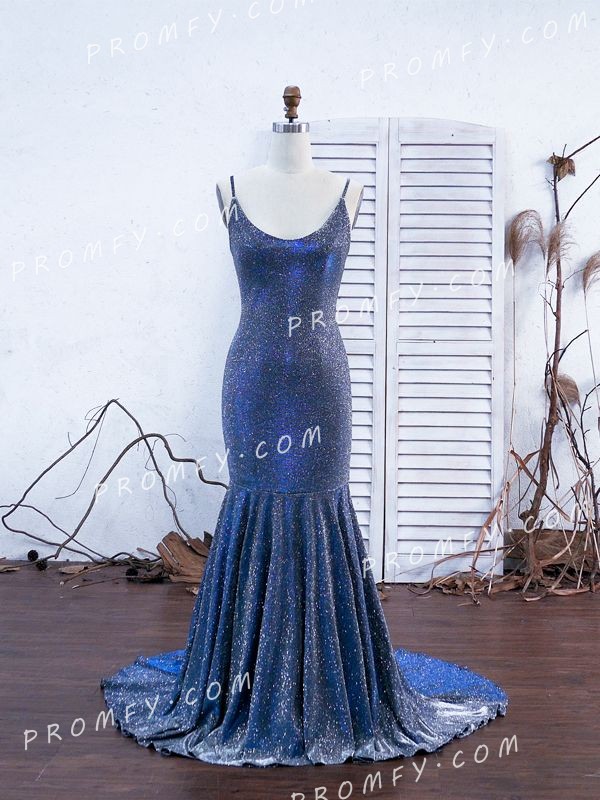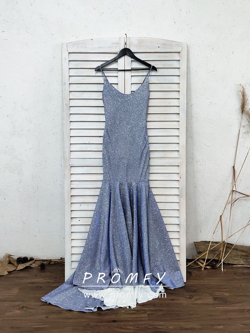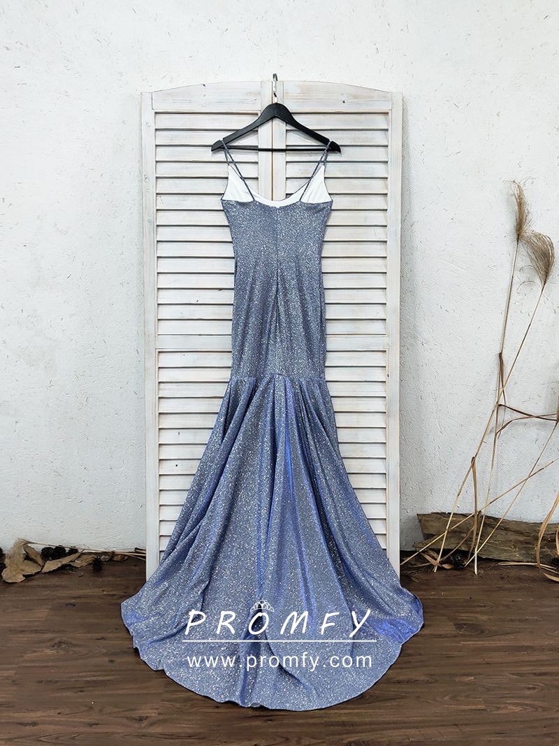 Sparkly charcoal grey lurex body hugging mermaid floor-length African American formal prom, evening, military ball formal dress. Scoop neckline with spaghetti straps and long train.