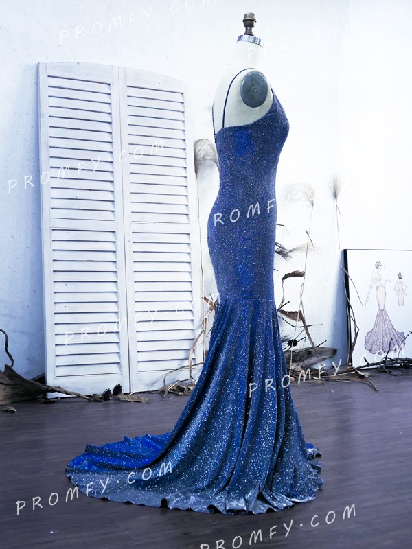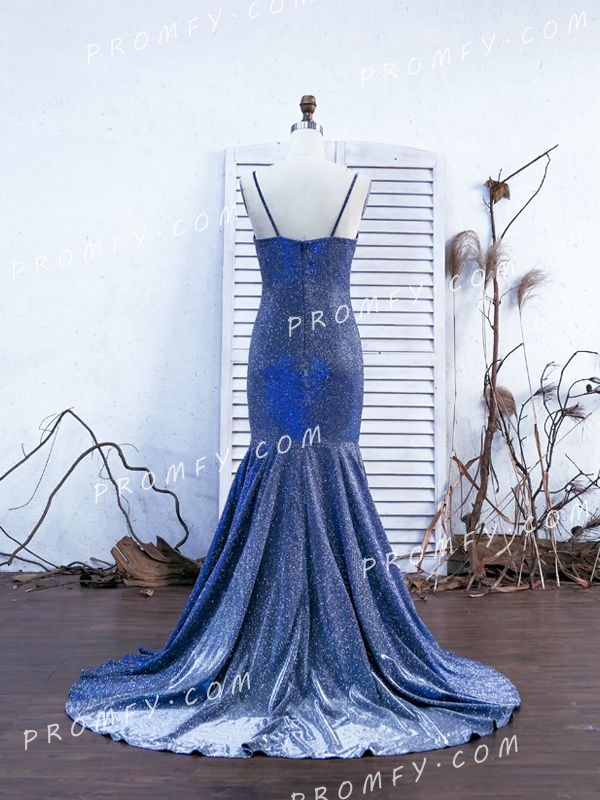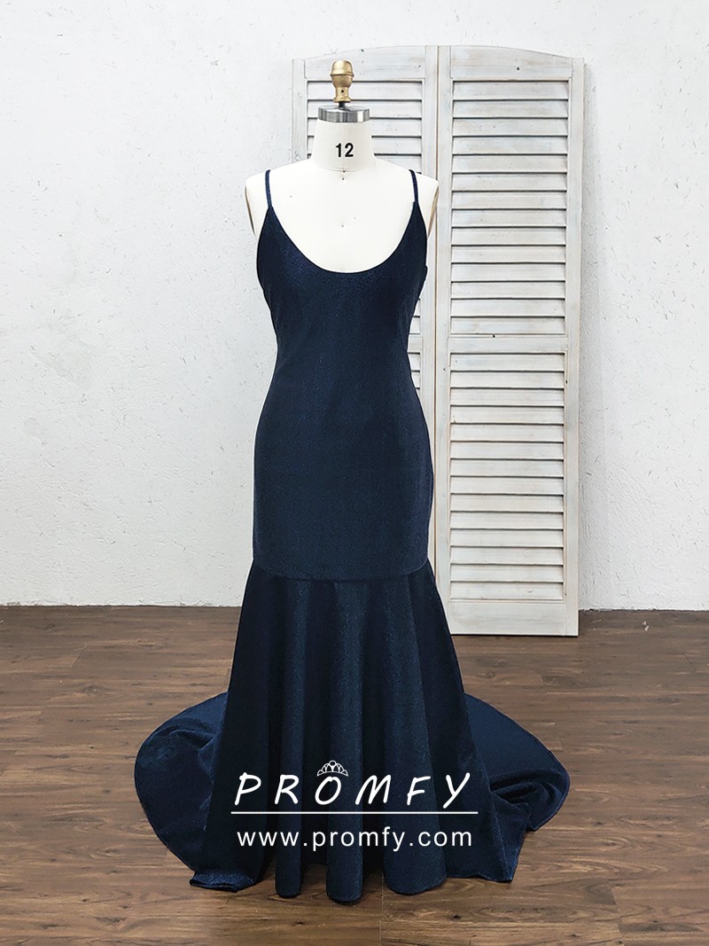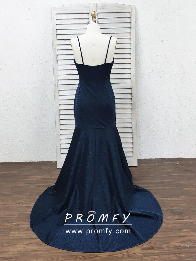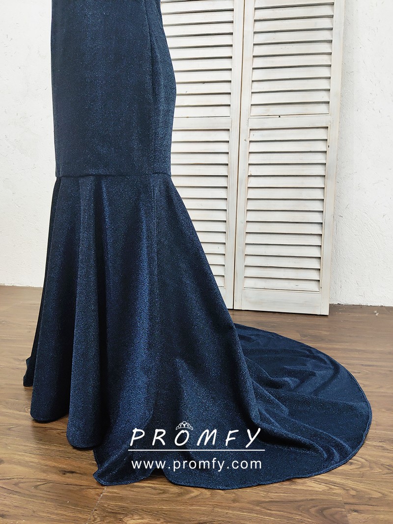 Sparkly charcoal grey lurex body hugging mermaid floor-length African American formal prom, evening, military ball formal dress. Scoop neckline with spaghetti straps and long train.