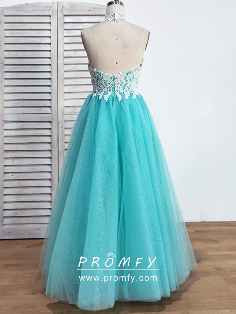 White Lace Cyan Blue Tulle Halter Neck Prom Dress