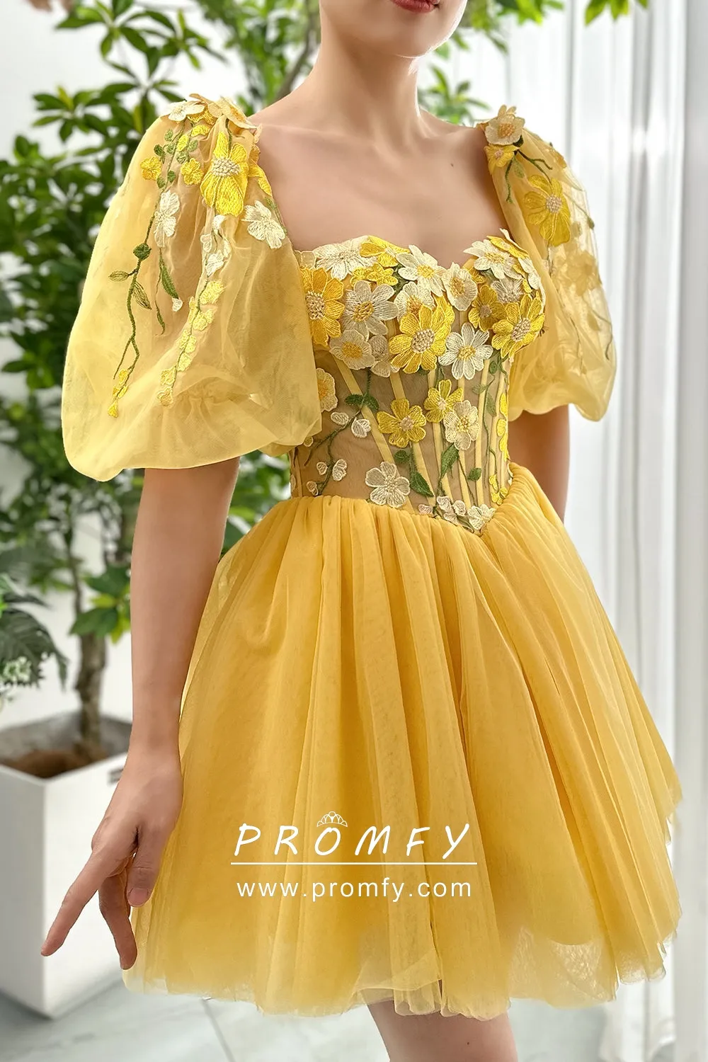 Brighten up your wardrobe with this fairy sweetheart neckline corset short prom dress, adorned with floral embroidery in a vibrant yellow hue. Ideal for prom, birthdays, homecoming, or cocktail parties, it showcases a delicate floral lace corset bodice with cute short puff sleeves, vintage basque waist, and an A-line puffy tulle short skirt adds a playful flair. The lace-up low back completes the look with a touch of elegance.